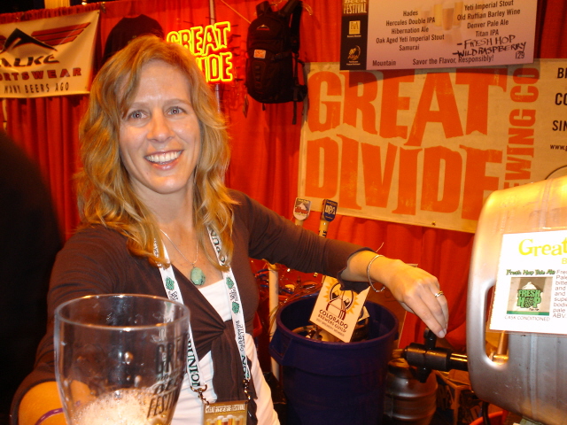 Kerri "The Beer Wench" Allen and I were honored to be included in the panel of judges at the 2007 Great American Beer Festival in Denver, Colorado. Held October 11-13, the 2007 GABF was the first time that all four public sessions sold out (in advance, no less). More than 46,000 people attended, and this magnificent event really demonstrates the popularity of craft beers in today's market. Kerri shares a brew with a fellow GABF judge at the Sandlot. More than 100 judges sniffed and sipped blind beer samples for three days to evaluate 2,793 beers and pick the best entries and top breweries for this year’s festival. A total of 222 medals were awarded in 75 beer style categories (see complete list at bottom of this page). A gold, silver or bronze medal from the GABF is the most coveted award available to American brewers, and the GABF judges do a marvelous job in picking the brews that have the best and most appropriate properties of each particular beer style. This year 473 breweries entered 2,793 beers making 2007 the most competitive GABF on record. Only 8 percent of all beers entered earned a medal. In total, 142 breweries (30 percent of all those participating) won at least one medal this year. Only 62 breweries (13 percent of all those participating) won at least one gold medal this year. As in recent years, the popular style of American-style India Pale Ale drew the largest number of entries with 120 in total. This year the competition saw impressive growth in the Fruit and Vegetable Beer category from 46 entries in 2006 to 94 entries in 2007. The Wood- Barrel-Aged Beer category also expanded -- going from 58 entries in 2006 to 72 entries in 2007. I was lucky enough to judge delicious rounds in both Fruit and Vegetable and Wood Barrel-Aged beers this year. Along with Kerri and I, the GABF judge panel consisted of notable beer and brewing individuals such as Tomme Arthur (Pizza Port in CA), Ray Daniels (Brewers Association), Mark Dorber (The Anchor in UK), Steve Dresler (Sierra Nevada in CA), Teri Fahrendorf (formerly of Steelhead in OR), Paul Gatza (Brewers Association), Travis Hixon (Blackstone in TN), Lyn Kruger (Siebel Institute in IL), Garrett Oliver (Brooklyn Brewery in NY), Charlie Papazian (Brewers Association), John Pinkerton (Moon River Brewing in GA), Chuck Skypeck (Boscos in TN), Carol Stoudt (Stoudt Brewing in PA), and many others. Left Hand booth at the 2007 GABF Kerri and I landed in the mile high city on Tuesday, October 9 and attended a judges orientation that focused on sensory calibration regarding alcoholic strength. The informative session was conducted by Christopher Bird of the Alltech Institute of Brewing & Distilling and Dr. Gary Spedding (Brewing & Distilling Analytical Services). A sociable judges' reception followed at Denver's Rock Bottom Brewery. Our actual judging sessions took place on October 10-12. Mary Valles of Denver's Great Divide Brewing Co. pours a cask ale sample at the GABF The public tasting sessions at the GABF are always a delight. In 2007 there were over 1,800 beers on tap on the festival floor -- the largest selection of American beers ever assembled on the planet. The festival floor was divided into U.S. regions: South, Northeast, North Central, Mountain West, Pacific, and Pacific Northwest. About 18,000 gallons of beer were consumed over the three days of the festival, and attendees were also treated to several demonstrations involving cooking with beer and pairing beer with certain foods. Marty Jones (with can in hand) - Oskar Blues Brewing, Lyons, CO "What people in
